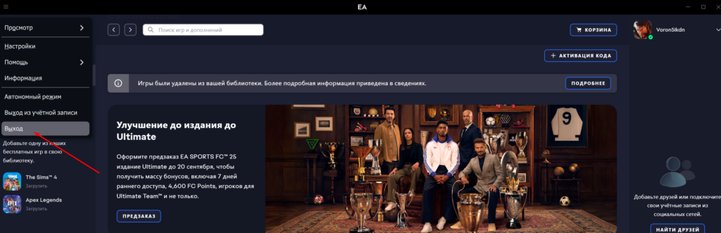 После того как вы закончили играть важно в трее закрыть EA App лаунчер нажав ПКМ → ВЫЙТИ.