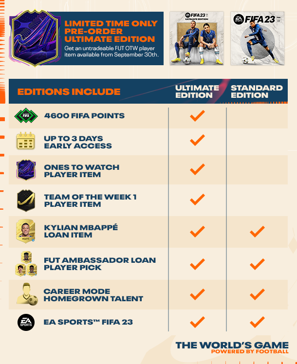 Всемирная играВ EA SPORTS™ FIFA 23 всемирная игра становится еще лучше: технология HyperMotion2 обеспечивает еще большую реалистичность игрового процесса, после выхода в игре в виде обновлений будут представлены как мужской, так и женский FIFA World Cup™, добавлены женские команды, кроссплатформенная игра* и многое другое. Оцените непревзойденную реалистичность — в FIFA 23 19 000+ игроков, 700+ команд, 100+ стадионов и 30+ лиг.Технология HyperMotion2Powered by Football™, EA SPORTS™ FIFA 23 впервые представляет технологию HyperMotion на ПК — благодаря двукратному увеличению количества записанных движений игровой процесс становится ещё реалистичнее. Технология HyperMotion2 открывает новые возможности в FIFA 23 и использует более 6000 реальных анимаций, созданных из миллионов кадров Передового захвата движений в матче 11 на 11. В результате FIFA 23 становится ещё ближе как к мужскому, так и к женскому футболу, а игроки более естественно перемещаются на поле, благодаря совершенно новой системе дриблинга, новой механике набора скорости и т.д.FIFA World Cup™Играйте на международных турнирах высшего уровня — FIFA World Cup Qatar 2022™ и FIFA Women’s World Cup Australia and New Zealand 2023™ — в FIFA 23 вы сможете оценить весь накал страстей главного футбольного турнира в мире, который появится в игре после выхода и без дополнительной платы. А в FIFA 23 Ultimate Team™ вас ждёт целый сезон контента, посвящённого FIFA World Cup Qatar 2022™, с помощью которого вы сможете добавить своей команде колорита сборных.FIFA 23 Ultimate Team™Соберите команду вашей мечты и играйте в самом популярном режиме FIFA — выбирайте игроков в состав из тысяч кандидатов и воспользуйтесь бесчисленными вариантами персонализации вашего клуба на поле и за его пределами. Играйте в одиночку в Squad Battles, вместе в кооп-игре FUT, онлайн в Division Rivals или против лучших игроков в FUT Champions, FIFA Ultimate Team™ — это ваша связь с миром футбола на всём протяжении сезона.FIFA 23 даёт новое определение системе сыгранности в Ultimate Team, обеспечивая большую гибкость в подборе состава, и упрощает игру с друзьями благодаря впервые появившейся кроссплатформенной игре. А на футбольном поле вы сможете оценить совершенно новый способ игры в Моментах FUT — одиночных испытаниях, основанных на ситуациях из реальных матчей, — или играть и получать награды для вашего клуба в Кампаниях FUT.Женский футболВ FIFA 23 дебютирует женский клубный футбол, а это значит, что у вас будет возможность играть лучшими женскими командами мира.
