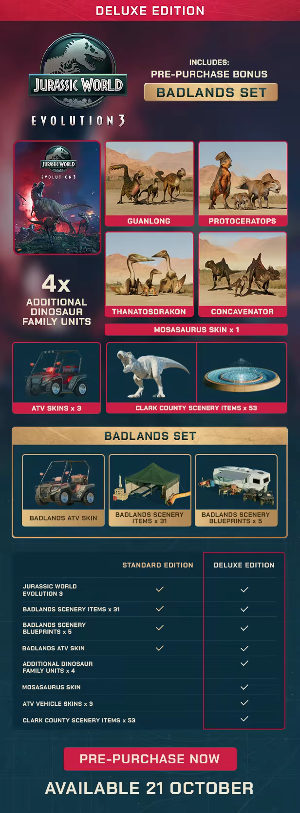 Создавайте невероятные парки с помощью новых творческих инструментов, которых не было в предыдущих частях серии Jurassic World Evolution! Вы можете редактировать ландшафт, настроить его по своему вкусу и добавить уникальные элементы в ваш парк.