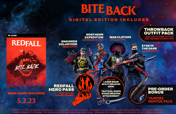 В Redfall гармонично сочетаются элементы индивидуальной и многопользовательской игры — храбро сражайтесь против тьмы в одиночку или возьмите с собой от одного до трёх единомышленников. Вы с командой можете использовать различные комбинации стартового снаряжения. Объединяйте навыки и ищите хитроумные методы борьбы с вампирским апокалипсисом. На пути вам будет попадаться разнообразное оружие, которое можно настроить под себя. У каждого героя — свой набор уникальных способностей, которые следует комбинировать и улучшать, адаптируя к выбранному стилю игры.
