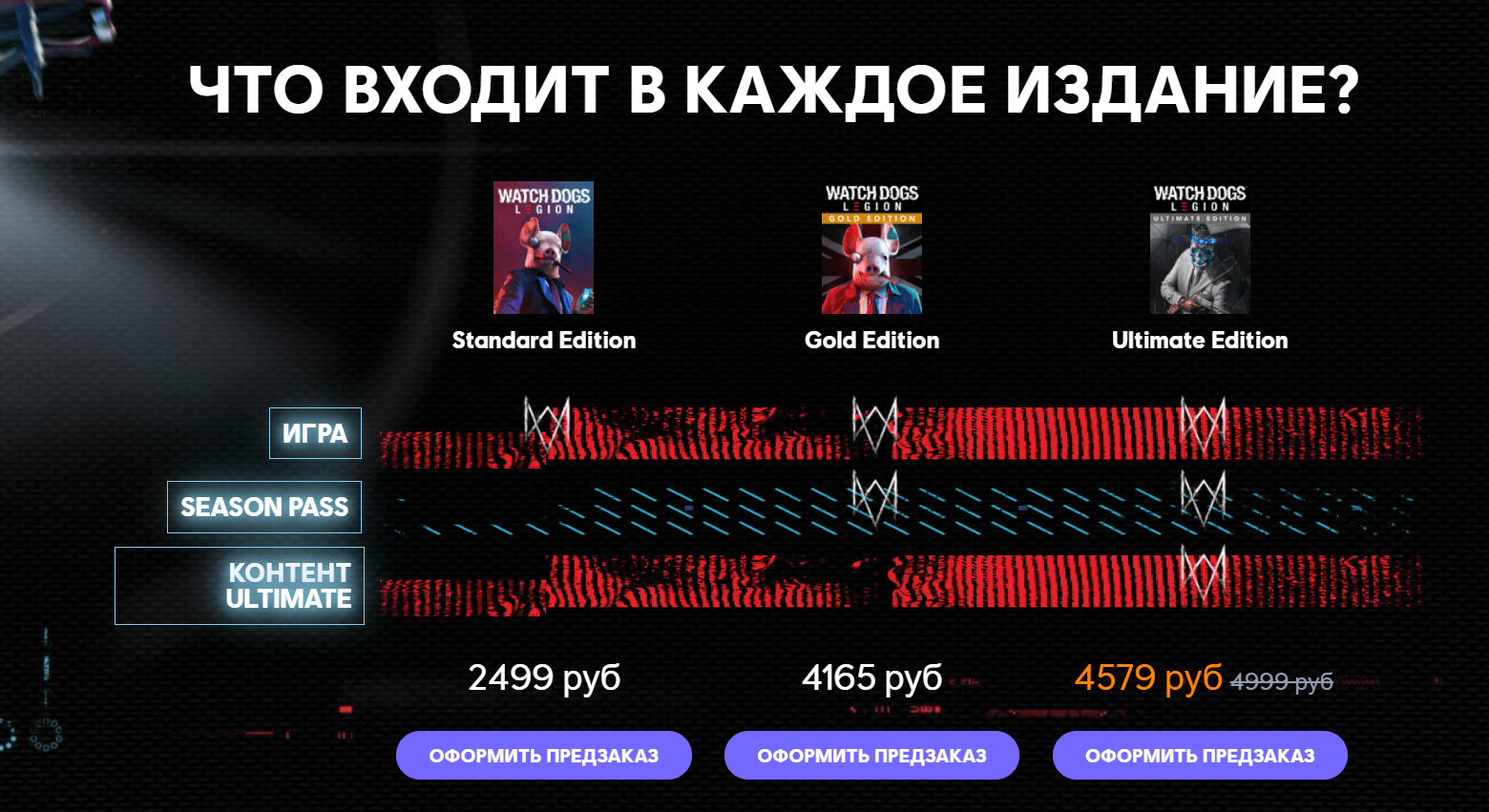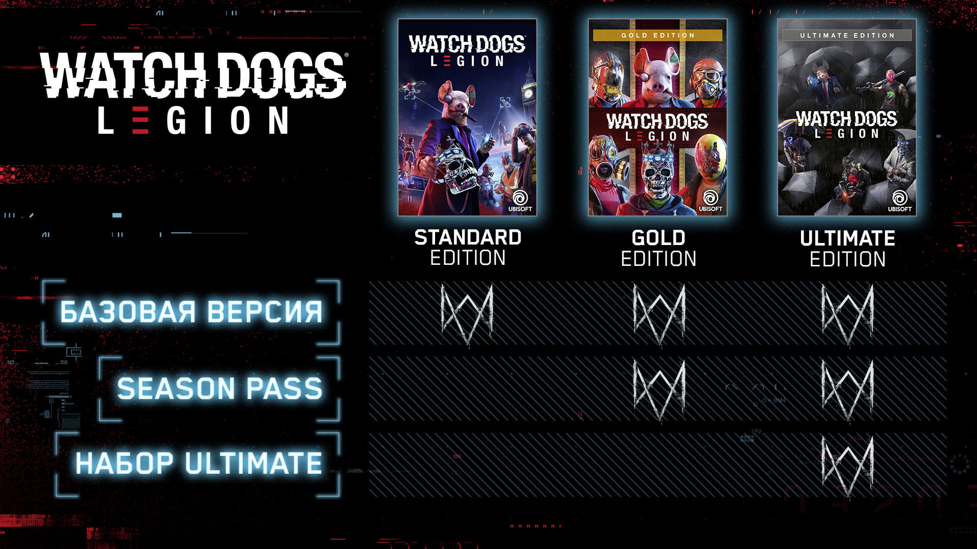 Лондон переживает тяжелые времена. Ваша задача - создать сопротивление. Вы сможете завербовать любого лондонца и сыграть за него. У каждого - своя история, характер и набор навыков. Взламывайте дронов, используйте ботов-пауков и дополненную реальность. Исследуйте открытый мир Лондона и выполняйте побочные задания. Играйте с друзьями по сети, проверяя свои силы на поздних этапах игры.Получите максимум возможностей благодаря Season Pass: • Одно масштабное дополнение, включающее в себя два эпизода: в захватывающей кампании вас ждут встречи со старыми друзьями и новыми героями. • Сыграйте за четырех новых уникальных героев с особыми способностями. • 3 дополнительных задания DedSec: продлите ваши приключения в Watch Dogs: Legion. • Раскраска для машины ""DedSec"", доступная сразу после выхода игры. • Издание первой игры серии Watch Dogs: Complete Edition, доступное в день выхода. Насладитесь дополненной версией подлинного хита 2014 года! Сыграйте за гениального хакера Эйдена Пирса, готового превратить Чикаго в собственное оружие ради мести. В издание входят Season Pass, новый режим игры, дополнительные костюмы, оружие и задания, а также новая кампания, в которой можно сыграть за легендарного хакера Ти-Бона!
