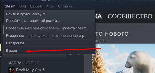 7. Выходим из игры и нажимаем кнопку выход в Steam