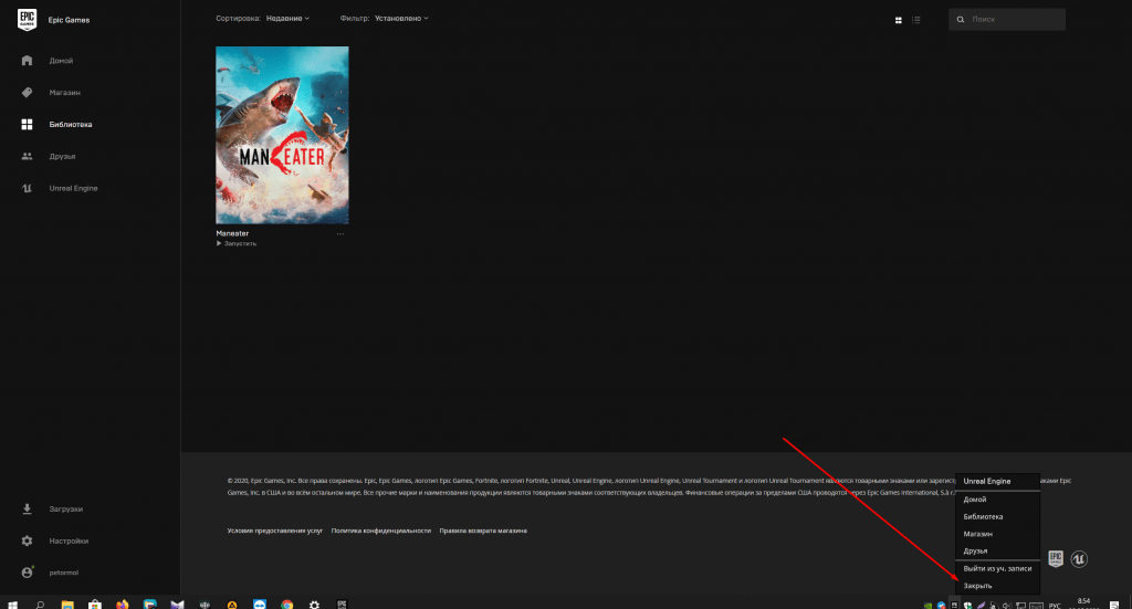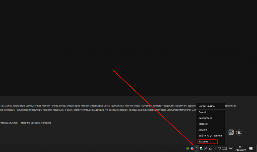 - Когда наигрались, также выходим с игры, включаете интернет и если нужно жмем в трее ЗАКРЫТЬ EpicStore, не путайте с ВЫЙТИ!