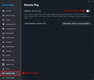 - 1.Откройте «Steam» (в левом верхнем углу) → «Настройки» → «Remote Play» и отключите эту функцию. Если установлен PIN-код, этот шаг можно пропустить.