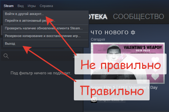 Важно перед переходом в один из клиентов Steam всегда жмем перед запуском другого клиента кнопку
