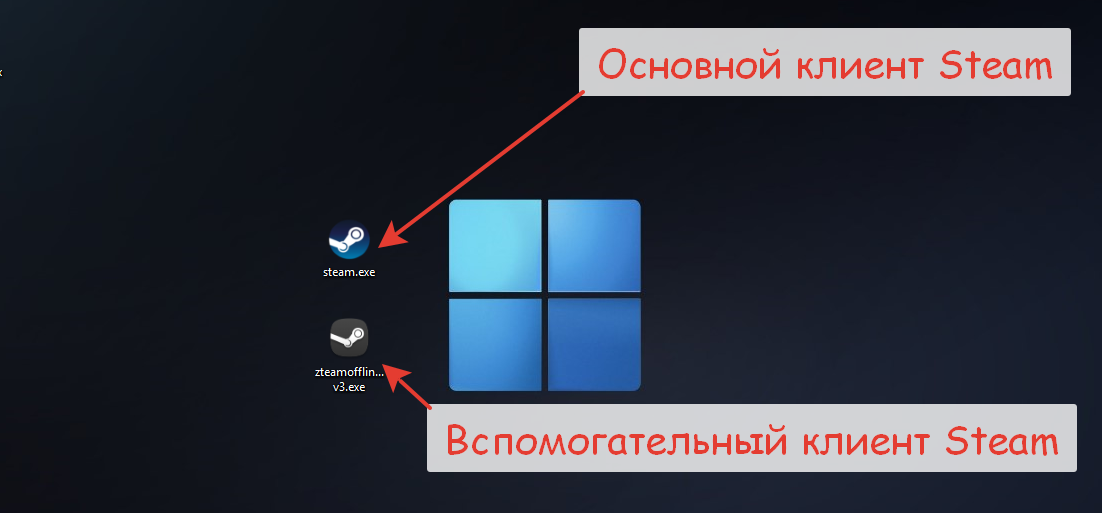 Вспомогательный Steam — запускает клиент из папки Steam2 на котором вы активировали оффлайн активацию