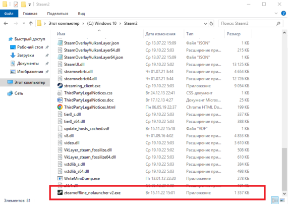Скаченный файлик «zteamoffline_nolauncher.exe» переносим в корневую папку Steam2.