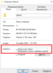 3. Убираем с папки Steam2 атрибут «Только чтение» :