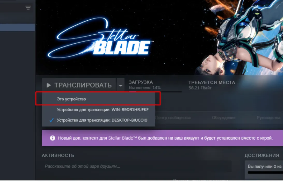 Ставим игру на загрузку убрав галочку «Создать ярлык на рабочем столе» и дожидаемся окончания загрузки . Если вместо кнопки “УСТАНОВИТЬ” у вас написано “ТРАНСЛИРОВАТЬ”, то нажмите стрелочку справа от этой кнопки и выберите там “ЭТО УСТРОЙСТВО” пример wp-Screenshot